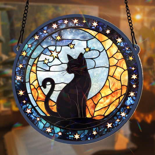 Black Cat, Book, & The Moon - Personalized Holographic Window Hanging Suncatcher
