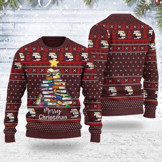 Book Pine Merry Christmas Ugly Sweater Book Lovers Gift USW03