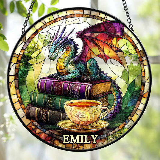 Book Reading, Tea Drinking, Dragon Loving - Personalized Stained Glass Window Hanging Suncatcher