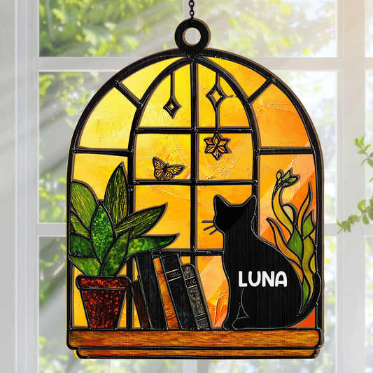 Stained Glass Black Cat And Book - Personalized Window Hanging Suncatcher
