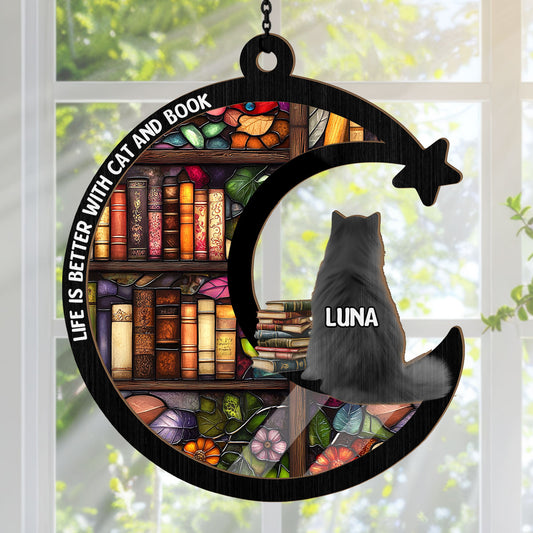 Bookish Cat On The Moon - Personalized Suncatcher Ornament