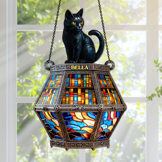 Black Cat On Old Library - Personalized Window Hanging Suncatcher