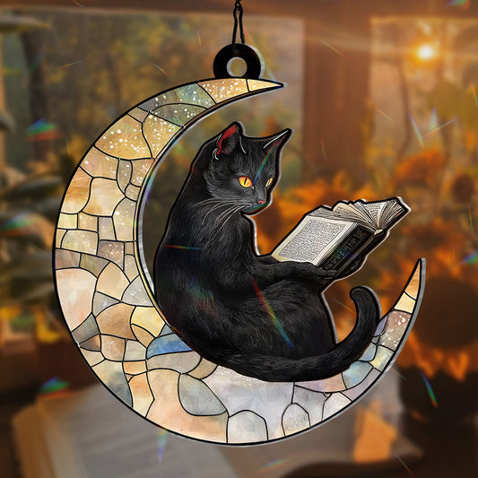 Cat Book On The Moon - Personalized Holographic Window Hanging Suncatcher