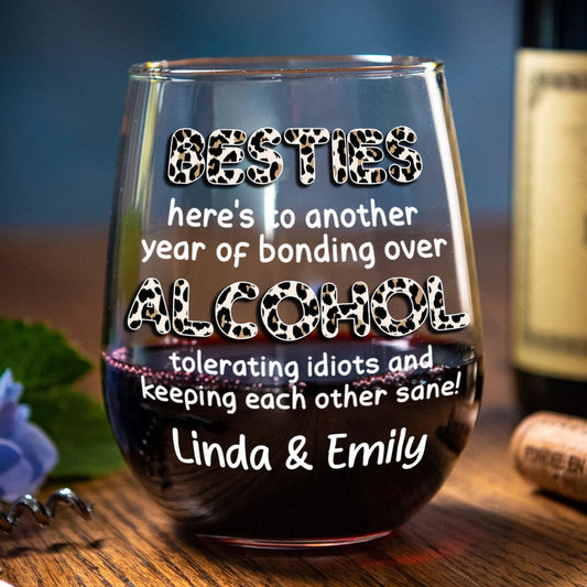 Besties, Alcohol Tolerating, Bonding Over, Keeping Each Other Sane - Personalized Stemless Wine Glass