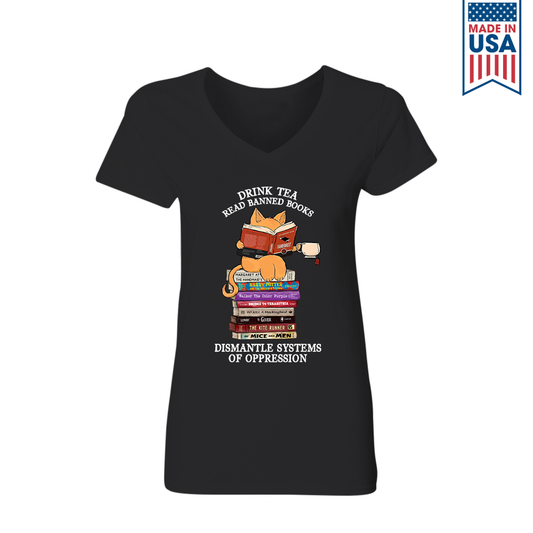Drink Tea Read Banned Books Dismantle Systems Of Oppression Book Lover Gift Women's V-neck T-shirt TSVB200