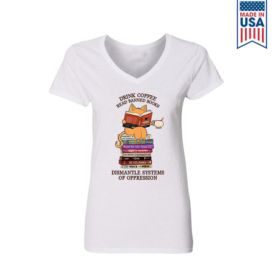 Drink Coffee Read Banned Books Dismantle Systems Of Oppression Book Lover Gift Women's V-neck T-shirt TSVW197