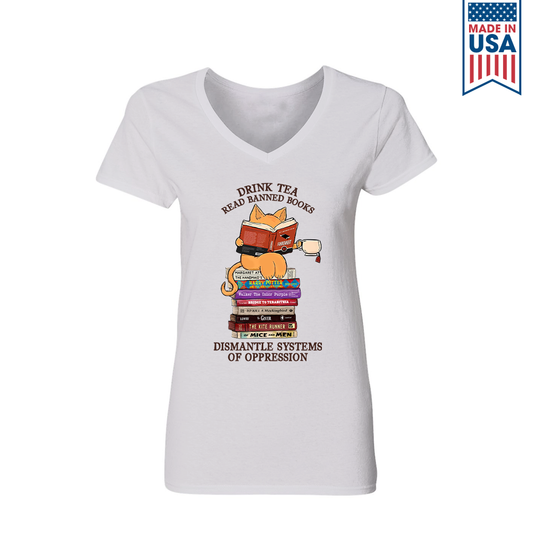 Drink Tea Read Banned Books Dismantle Systems Of Oppression Book Lover Gift Women's V-neck T-shirt TSVW199