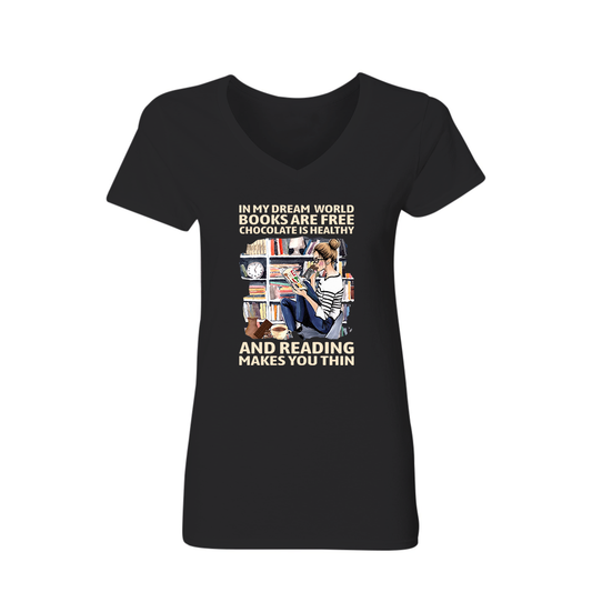 In My Dream World Books Are Free Chocolate Is Healthy And Reading Makes You Thin Book Lovers Gift Women's V-neck T-shirt TSVB50