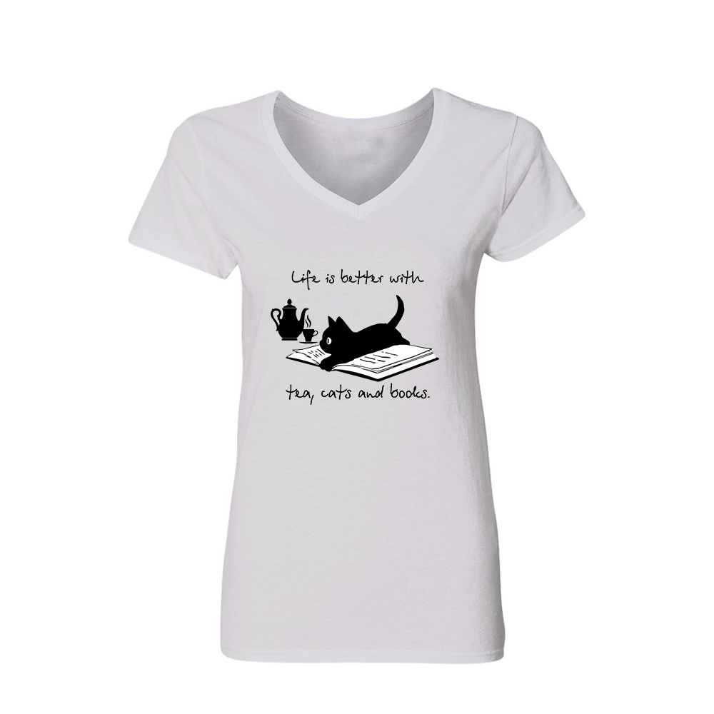 Life Is Better With Tea, Cats And Books Book Lovers Gift Women's V-neck T-shirt TSVW35